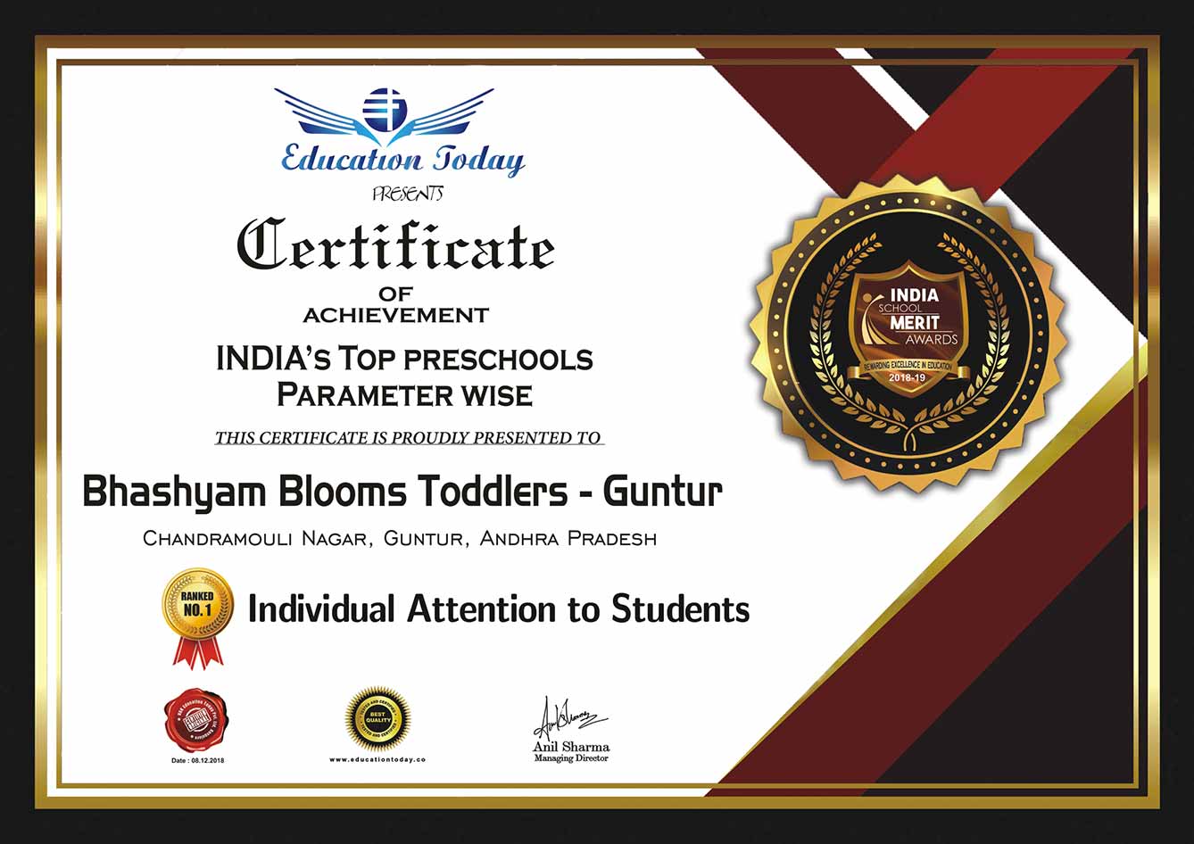Bhashyam Blooms has provided a safe and comfortable environment for our children to learn and develop. The teachers understand their students and encourage them to participate in all activities and competitions.The most amazing part for us is the principal and staff for their efforts towards children development.